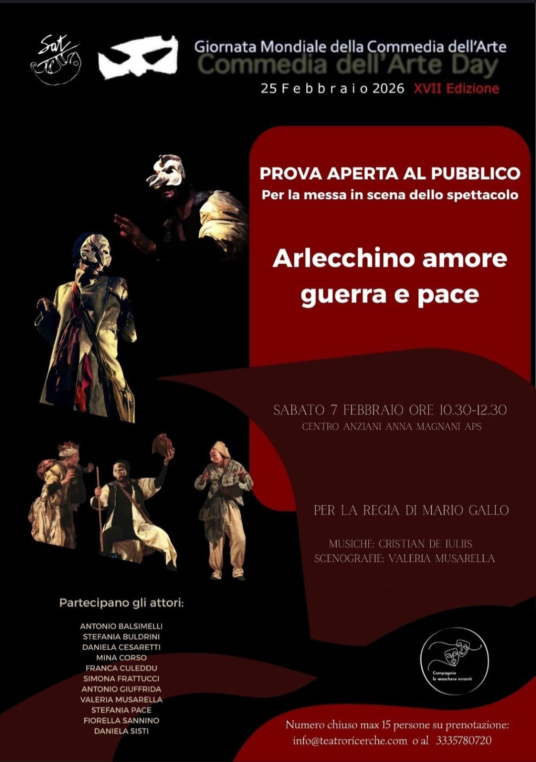 La Compagnia “Maschere erranti” invita un pubblico misto a una prova dello spettacolo “Arlecchino… amore, guerra e pace”. L’incontro ha lo scopo di promuovere la Commedia dell’Arte attraverso le nuove e le vecchie generazioni di potenziali spettatori che ancora poco conoscono questo meraviglioso modo di fare teatro tutto italiano, origine del nostro Carnevale, e non solo. La prova aperta sarà intervallata da momenti di storia, teoria e pratica dell’uso della maschera e dei suoi derivati (corpo, voce, movimento nello spazio dei caratteri), dove regista e attori racconteranno la Commedia dell’Arte anche tramite la propria esperienza sul palcoscenico, cercando di svelare limiti e potenzialità di una tecnica teatrale antica e moderna, faticosa e complessa, alla base della formazione dell’attore; sarà l’occasione, per il pubblico, di arricchire la propria conoscenza della nostra tradizione teatrale italiana, osservando dal vivo la costruzione di uno spettacolo che, seppur rispettando i canoni tradizionali dell’uso della mezza maschera, tende a rinnovare la Commedia dell’Arte attraverso la poesia e la pittura, con una forte componente di satira contemporanea, e un ritorno a un teatro utile che si spera possa risvegliare, nelle menti e nei corpi delle persone, la passione per la libertà e l’amore per l’essere umano.